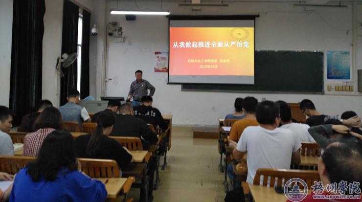 10月23日,机械与化工学院党委根据“不忘初心,牢记使命”主题教育要求,组织全体师生党员,在明理楼南楼301教室召开全面从严治党工作推进会。