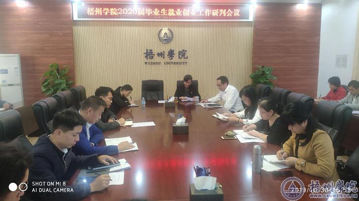 10月30日下午,我校在明理楼八楼第二会议室召开“梧州学院2020届毕业生就业创业工作研判会议”。学校党委副书记曹迎,学生工作部(处)相关领导、各二级学院分管学生工作的领导、学生工作处就业办公室全体人员,全体2020届毕业生辅导员参加会议。