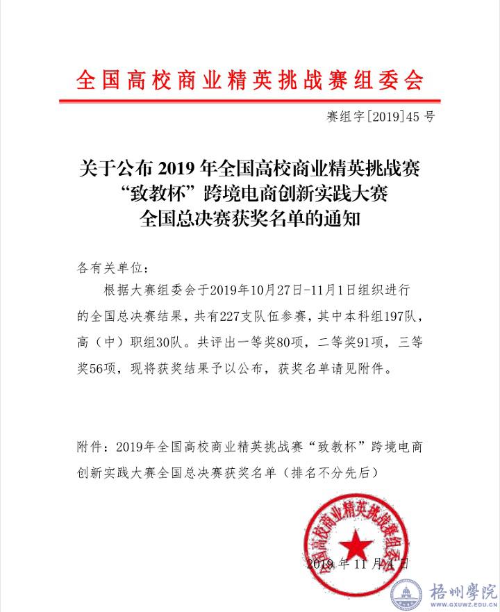 11月4日, 2019年全国商业精英挑战赛“致教杯”跨境电商创新实践大赛全国总决赛落下帷幕,我校国际经济与贸易专业2016、2017以及2018级学生组成的队伍均取得优异的成绩,所有队伍均获得一等奖。