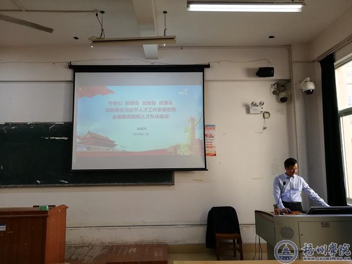 “人才是实现民族振兴、赢得国际竞争主动的战略资源。”11月5日下午,学校党委常委、副校长麻新纯结合近段时间以来的理论学习、革命传统教育以及到各有关职能部门和二级学院调研的情况,以“守初心、担使命、找差距、抓落实,深刻领会习近平人才工作重要思想,全面推进我校人才队伍建设”为题,给各有关职能部门和二级学院的党员上了一堂专题党课。