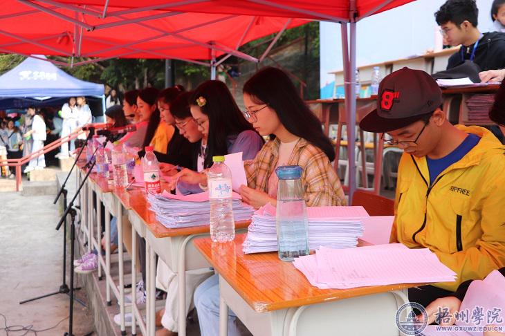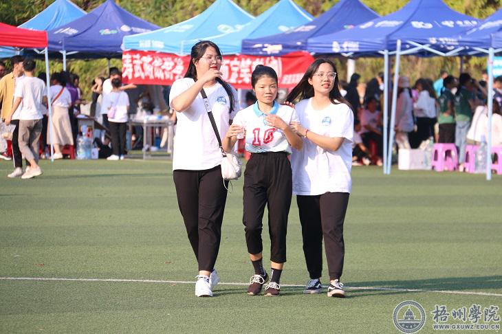尽管已经到了秋天,但是阳光依旧很强烈。跑道上,女子400米预赛正在如火如荼地进行,跑道的终点处,各个学院的志愿者们正严阵以待,有的手里拿着葡萄糖水,有的举着造型各异的应援牌,一切都准备就绪。“加油,商学院加油”“文传加油”……加油声突然爆发出来,运动员到达终点处,志愿者们立即冲上前搀扶运动员,为运动员递水、擦汗。这些动作他们不断地重复着,接过一个又一个冲过终点的运动员,他们被晒得发红的脸上始终洋溢着笑容。“我觉得这是我应该做的,他们正在为学院争取荣誉,而我们也要做到自己能做的事情。”穿着青年志愿者服装的2019级公共事业管理专业的覃雨嫣说。从运动会开始她就已经在终点处接人了,直到上午的赛事结束。不仅仅是法学与公共管理学院的志愿者如此,其它各个学院的志愿者们也奔波在赛场的各个角落,为校运会贡献自己的力量。