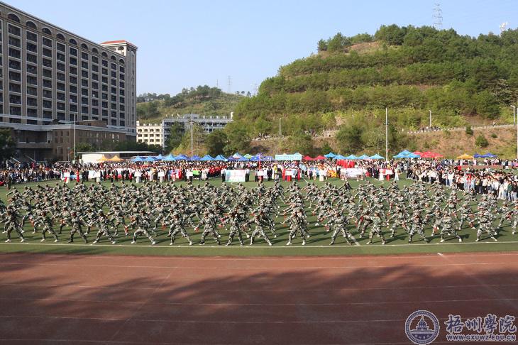 开幕式上,会牌队、各二级学院方块队、管乐队和国旗护卫队陆续入场。紧随着教官的一声口令,由我校商学院、外国语学院和文学与传媒学院226名女生组成的匕首操方队,在运动场上进行匕首操表演。