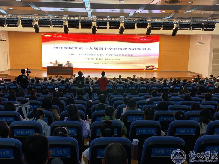 11月20日下午,我校在明理楼学术报告厅召开党的十九届四中全会精神专题学习会。自治区党校副校长、广西行政学院副院长韦日平教授、博士生导师应邀为我校师生作题为《认真学习贯彻党的十九届四中全会精神》专题报告。学校党委书记唐平秋主持学习会。
