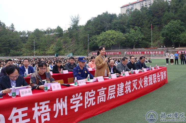本次演练由学校党委副书记曹迎、副校长邱房贵、保卫处处长谢仲文、学生工作部(处)部(处)长陈远武和梧州市消防救援支队领导等人指挥协调。学校3500余名师生、梧州市消防救援支队、广西桂东人民医院参加本次演练。