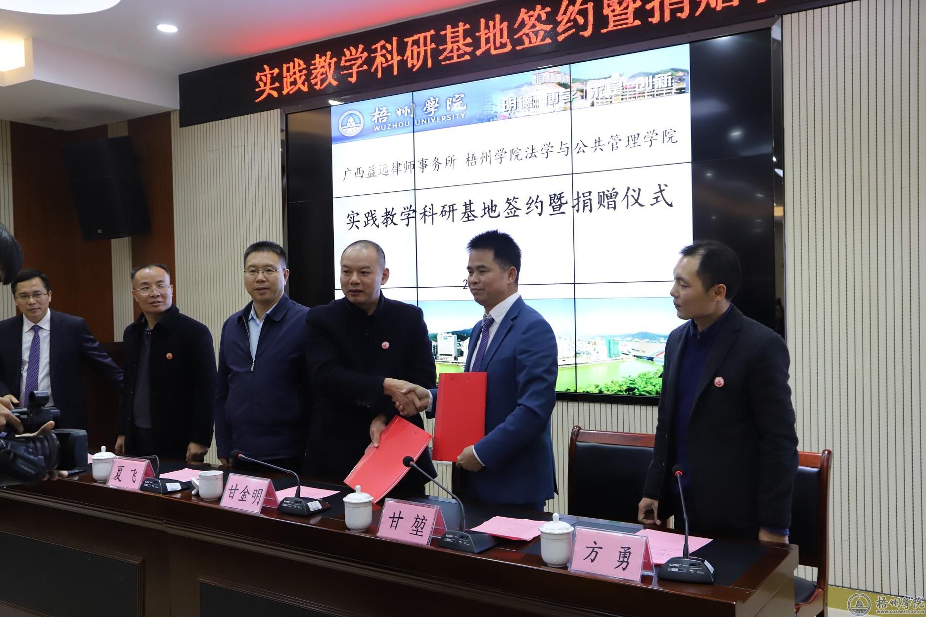 12月4日,正值国家宪法宣传日之际,我校法学与公共管理学院与广西益远律师事务所举行实践教学科研基地签约暨捐赠仪式。教育部本科教学工作审核评估专家、广西财经学院校长夏飞教授,学校副校长甘金明教授,广西益远律师事务所主任甘堃律师、执行主任韦发华律师等参加本次签约捐赠仪式。