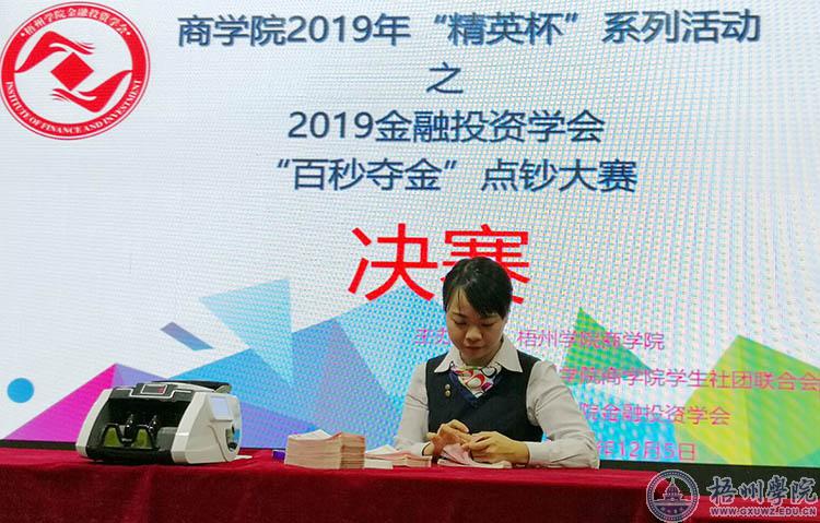 12月5日,商学院2019年“精英杯”启动仪式暨“百秒点钞”大赛在体育馆负一楼路演大厅举行。“百秒点钞大赛”吸引了130多名学生报名参赛。赛前商学院邀请了桂林银行的职员为同学们讲解点钞的基础知识,并进行了现场的演示。