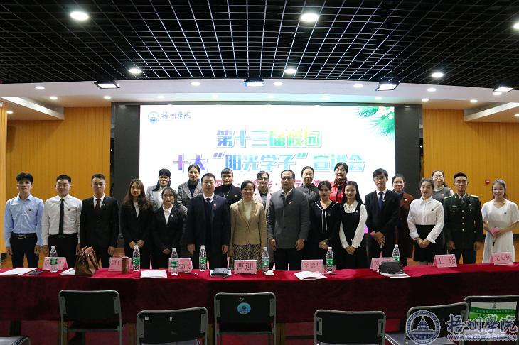 近日,我校在体育馆路演大厅举办第十三届校园十大“阳光学子”宣讲会。学校党委副书记曹迎出席宣讲会并致辞。参加宣讲会的有相关部门领导、老师以及二级学院学生代表。