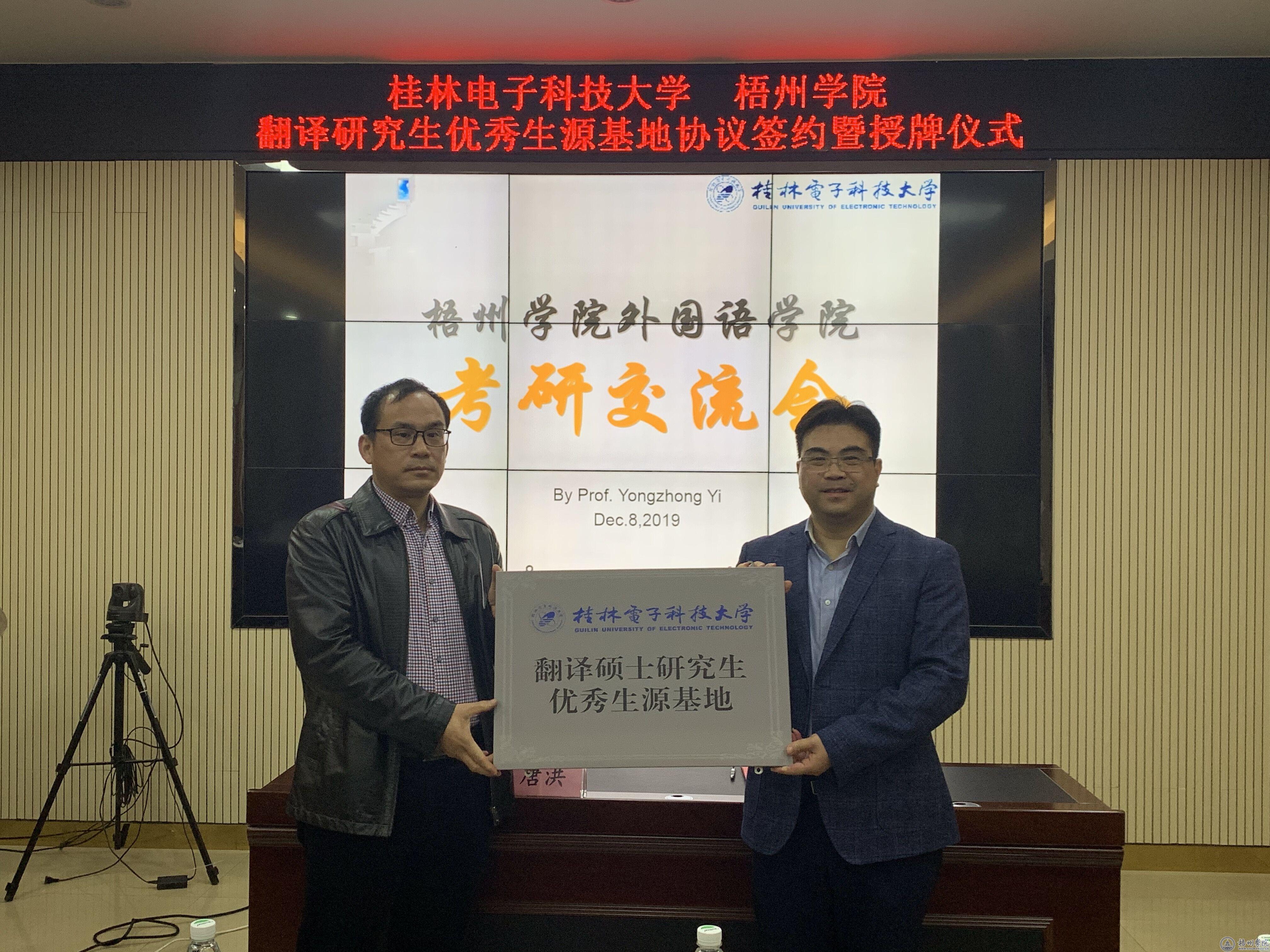 12月8日,桂林电子科技大学外国语学院唐洪副院长携研究生教育系主任易永忠教授到访我校开展“优质生源基地”签约,为外国语学院授“优质生源基地”牌匾,并举办专场研究生招生考试宣讲会。