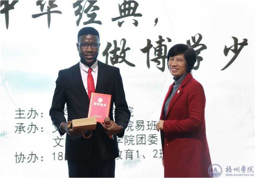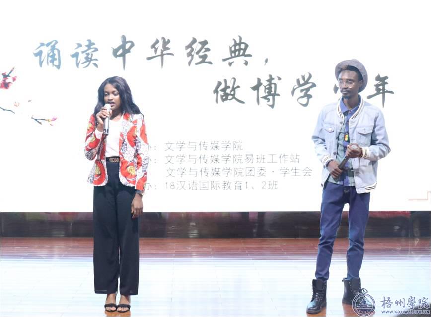 12月11日,由文学与传媒学院主办,文学与传媒学院易班工作站、文学与传媒学院团委·学生会承办的外国留学生中华经典诵读比赛在路演大厅举行,活动主题为“诵读中华经典,做博学少年”。文学与传媒学院院长莫敏,国际交流处处长何恩,文学与传媒学院党总支副书记何剑,汉语国际教育教研室主任何湘君,校团委兼职副书记李光先参加活动。