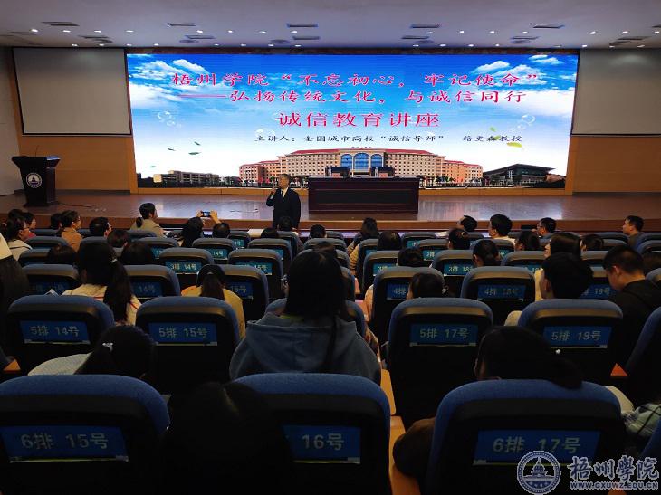 近日,全国城市高校“诚信导师”籍更森教授在我校学术报告厅作了以“‘不忘初心,牢记使命’——弘扬传统文化,与诚信同行”为题的诚信教育讲座,我校各二级学院分管学生工作领导和全体辅导员、500多名学生到场聆听讲座。讲座由学校党委副书记曹迎主持。
