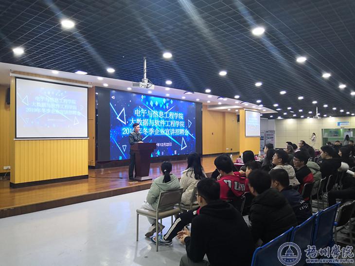 12月22日下午,电子与信息工程学院、大数据与软件工程学院在大学生发展中心路演大厅举行2019年冬季企业宣讲招聘会。本次招聘会是结合学院专业、毕业生特点,精心组织的一次双选招聘会。由学院领导、教研室主任、毕业班辅导员多渠道发布招聘会企业信息,邀请到以深圳市臻上科技发展有限公司、东莞德普特电子有限公司、方块教育科技(深圳)有限责任公司、深圳丰盈磁性材料有限公司、广西奥顺仪器有限公司、广西正瑞智能科技有限公司、东莞大普通信有限公司、东莞普联科技有限公司等为代表的工科类专业招聘单位参会,力求为毕业生提供多样化的应聘岗位。招聘会现场气氛热烈,展位前人头攒动,同学们纷纷就工作内容、发展空间、薪资待遇等问题向招聘单位进行咨询。