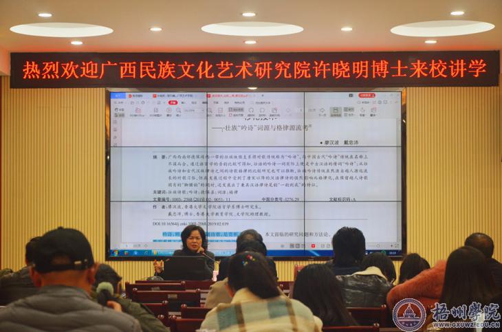 12月21日,广西民族文化艺术研究院副院长、《民族艺术》杂志主编许晓明研究员受邀到我校参加由广西伦理学会、云南民族伦理学会与学校马克思主义学院联合举办的“不忘初心、牢记使命”主题教育与伦理学的使命全国学术研讨会期间,应邀为我校宝石与艺术设计学院、文学与传媒学院教师作了题为“论文写作与投稿技艺——基于《民族艺术》编辑工作分析”讲座。文学与传媒学院院长莫敏主持讲座。
