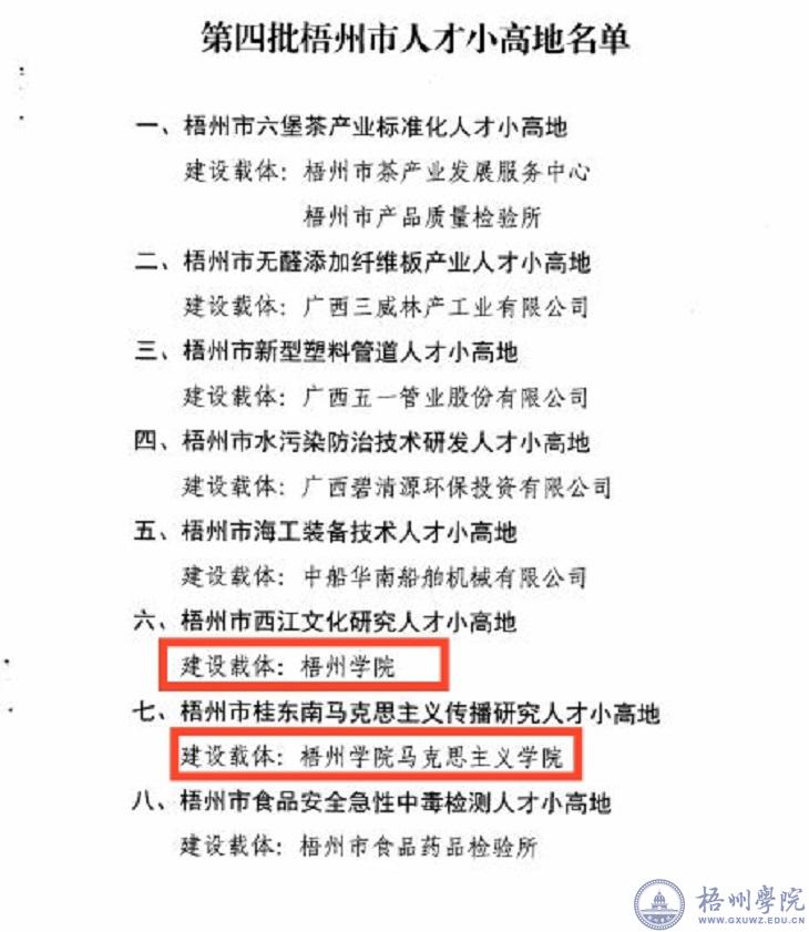 近日,梧州市委组织部、梧州市人力资源和社会保障局下文公布第四批梧州市人才小高地。我校获批梧州市西江文化研究人才小高地和梧州市桂东南马克思主义传播研究人才小高地。两个人才小高地的建立建设将有助我校更好地吸引和培养高层次人才,推进我校人才资源开发和高层次人才队伍建设。 (来源:人事处)