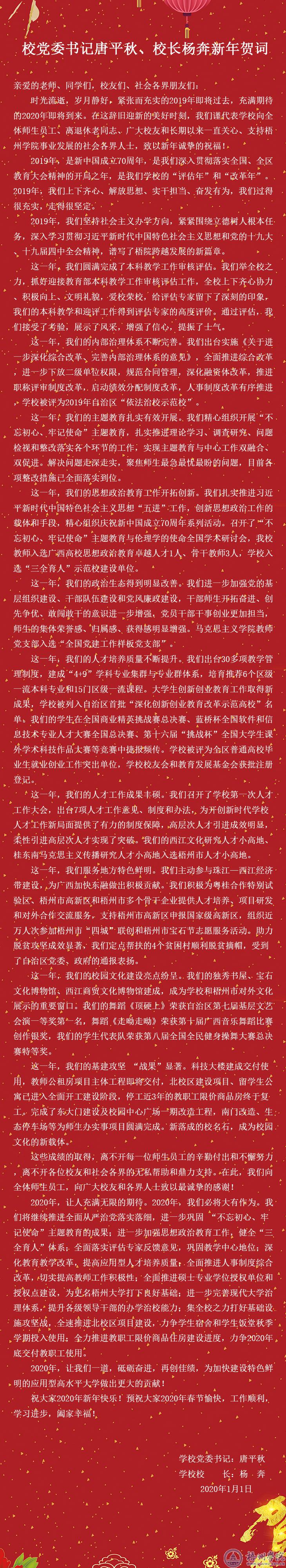 校党委书记唐平秋、校长杨奔新年贺词