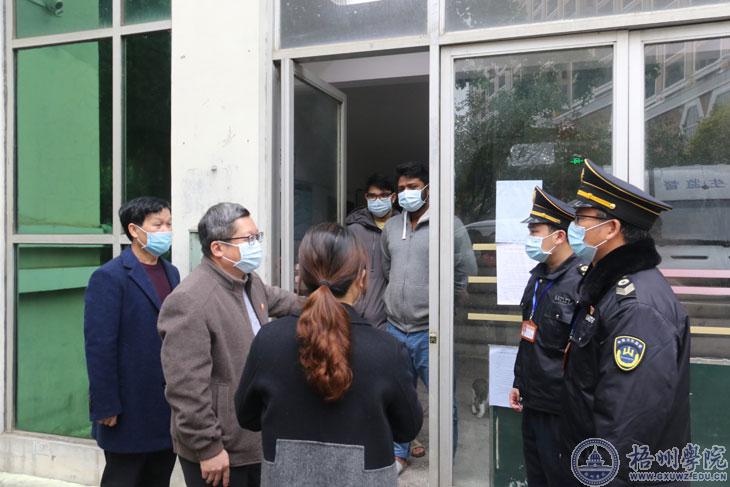 2月6日上午,杨奔校长到学生公寓楼检查指导疫情期间学校留学生服务管理工作,并看望正在接受隔离的外地返校的留学生。学校党委(校长)办公室、国际交流处等部门负责人参加工作检查。