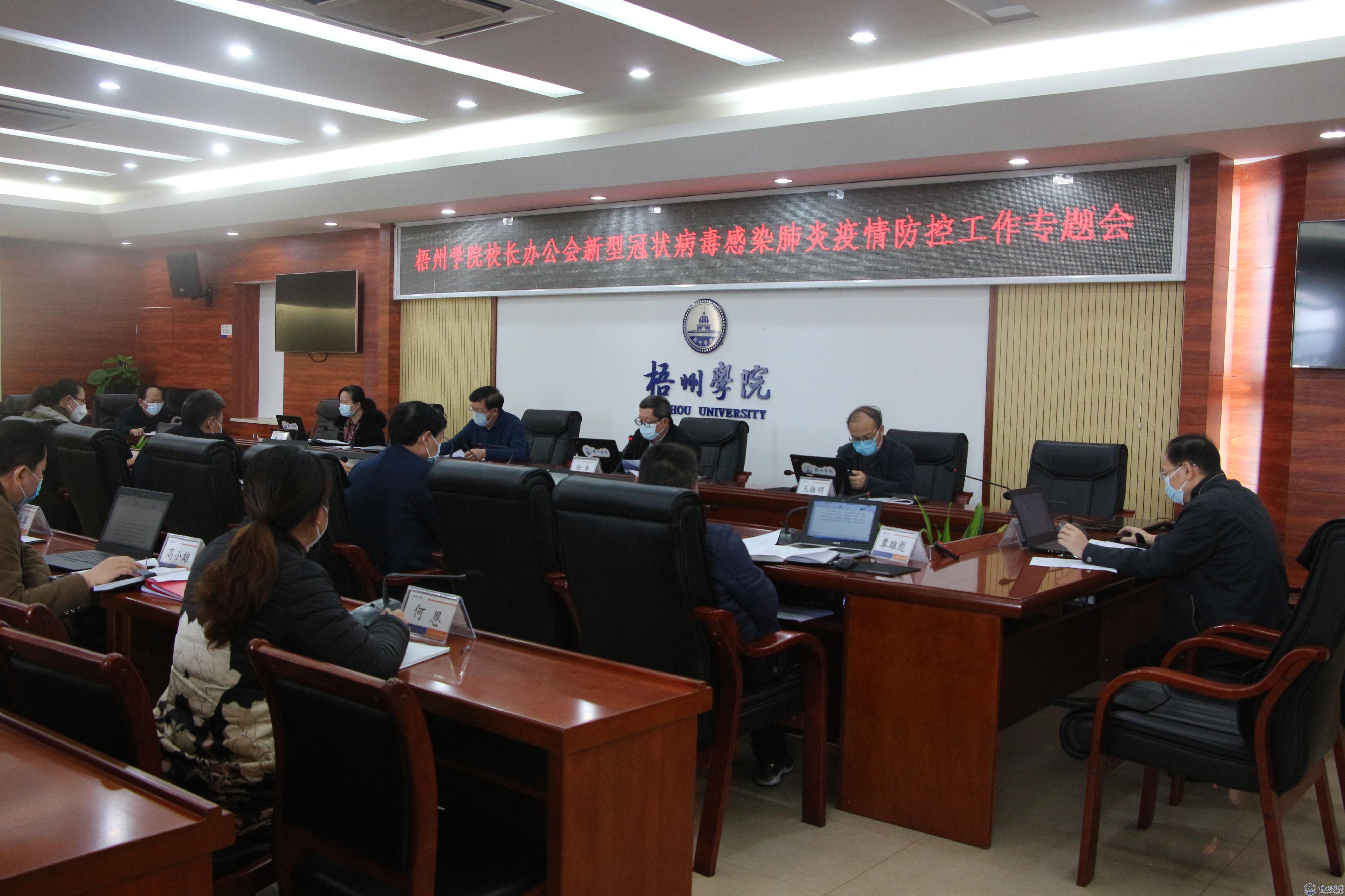 会上,杨奔传达了教育部部长陈宝生在全国教育系统新型冠状病毒感染肺炎疫情防控工作视频会议上的讲话及自治区教育厅有关通知精神、自治区新型冠状病毒感染的肺炎疫情防控工作领导小组指挥部第4号令。会议根据教育部和自治区有关会议、文件的有关要求,结合学校的实际,就我校2020年春季的开学时间、学生返校前后的人员管理、教学工作安排,校园出入管理及保安工作安排、留学生管理、后勤管理和物资保障、基建项目管理、舆情监控和引导、疫情防控责任落实等系列问题进行了认真研究,原则通过了《梧州学院春节后错峰返程加强疫情防控工作方案》。
