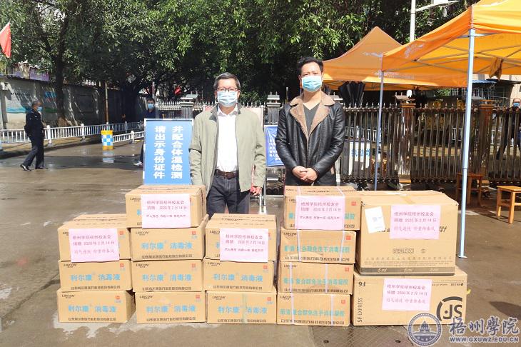杨奔校长(左)代表学校接收梧州校友会捐赠的防疫物资