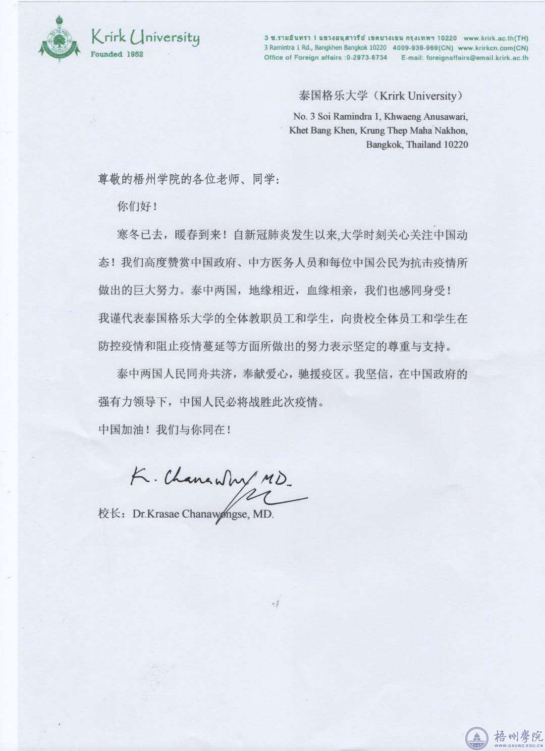 2月29日,泰国格乐大学(Krirk University)向我校发来慰问信。该校校长Krasae Chanawongse博士代表该校全体教职员工和学生在来信中向我校全体员工及学生致以诚挚慰问和深深关切。他表示,自新冠肺炎发生以来,事态的发展就一直牵动着泰国师生的心。同时泰方也见证了中国政府、中方医护人员和每位中国公民人为抗击疫情所做出的巨大努力,对我校在防控疫情和阻止疫情蔓延等方面所做出的努力表示了坚定的尊重与支持。他们坚信,在中国政府的强有力领导下,中国人民必将战胜疫情。