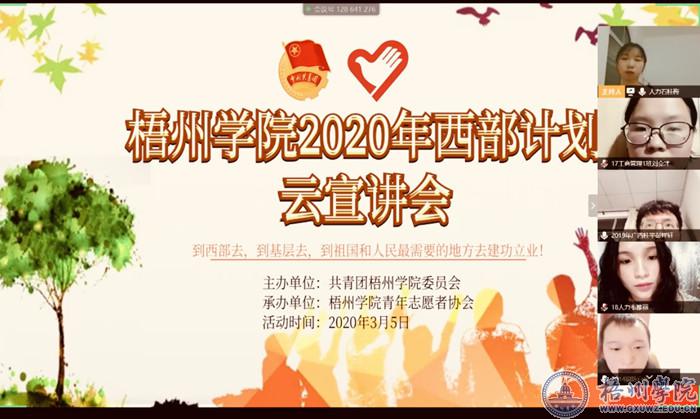 3月5日晚,梧州学院2020年西部计划云宣讲通过腾讯会议App平台在线上举行,会议邀请了我校往届分别在西藏、四川和广西参加西部计划志愿服务的陈自良、罗东平、彭祥轩三位校友作为宣讲人,共有150多名毕业生参加。 会上,宣讲人向同学们分享了他们的服务经历和心得体会,并一一解答了同学们的疑惑,他们鼓励毕业生要积极投身祖国建设,到西部去,到基层去,到祖国最需要的地方去建功立业。