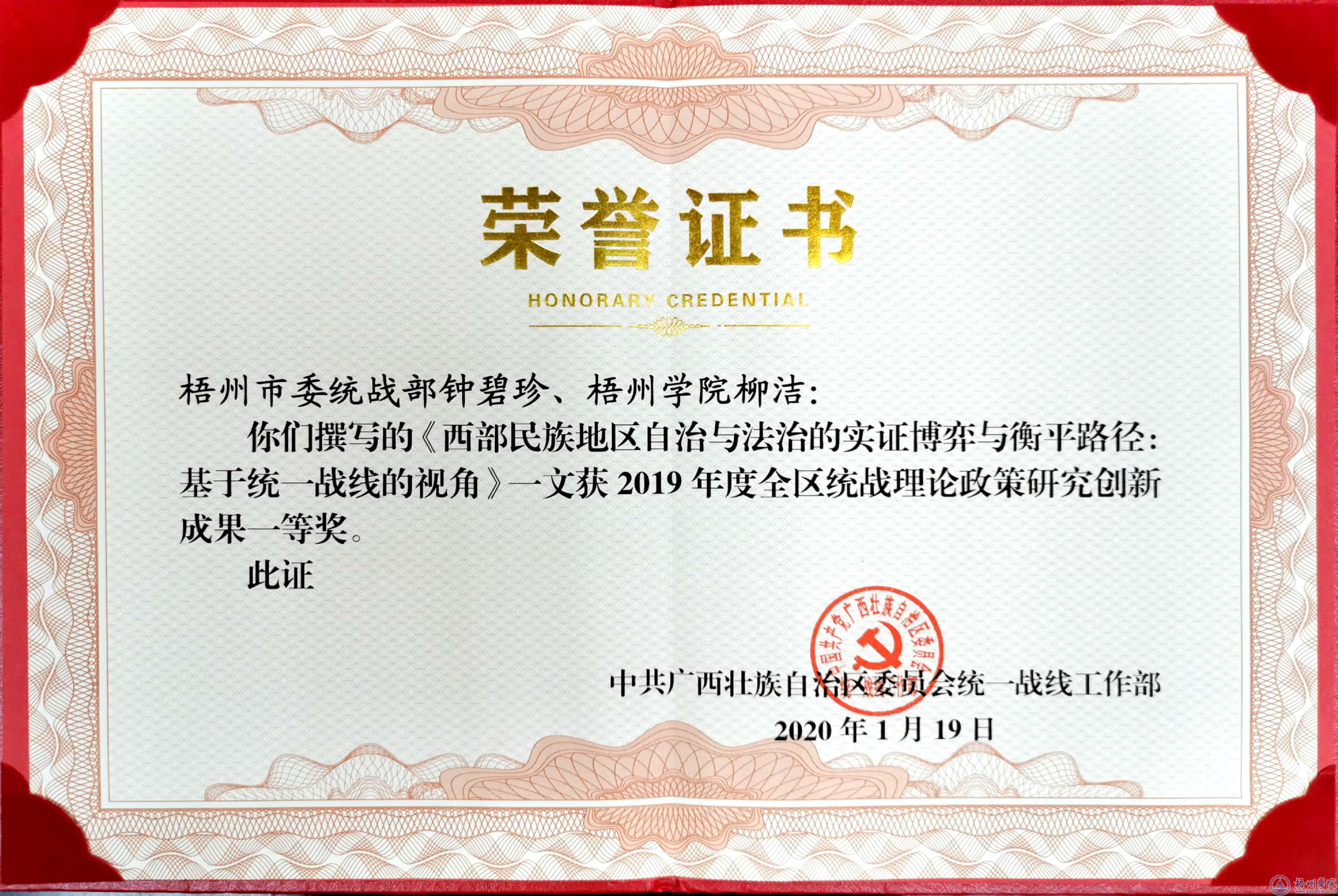 在2019年度全市统战理论政策研究工作评选活动中,我校党委统战部荣获先进单位。我校法律与公共管理学院柳洁和市委统战部钟碧珍撰写的《西部民族地区自治与法治的实证博弈与衡平路径:基于统一战线视角》荣获2019年度全区统战理论政策研究创新成果一等奖,同时荣获2019年度梧州市统战理论政策研究创新成果特等奖。我校团委秦伟与梧州市民宗委覃宏岩、盘振春撰写的《特色村寨建设视阈下蒙山长坪水韵瑶寨瑶族传统歌舞艺术永续发展的现状分析及传承对策》荣获2019年度梧州市统战理论政策研究创新成果二等奖。我校党委统战部撰写的《少数民族地区高校民族团结教育常态化机制研究》荣获2019年度梧州市统战理论政策研究创新成果三等奖。