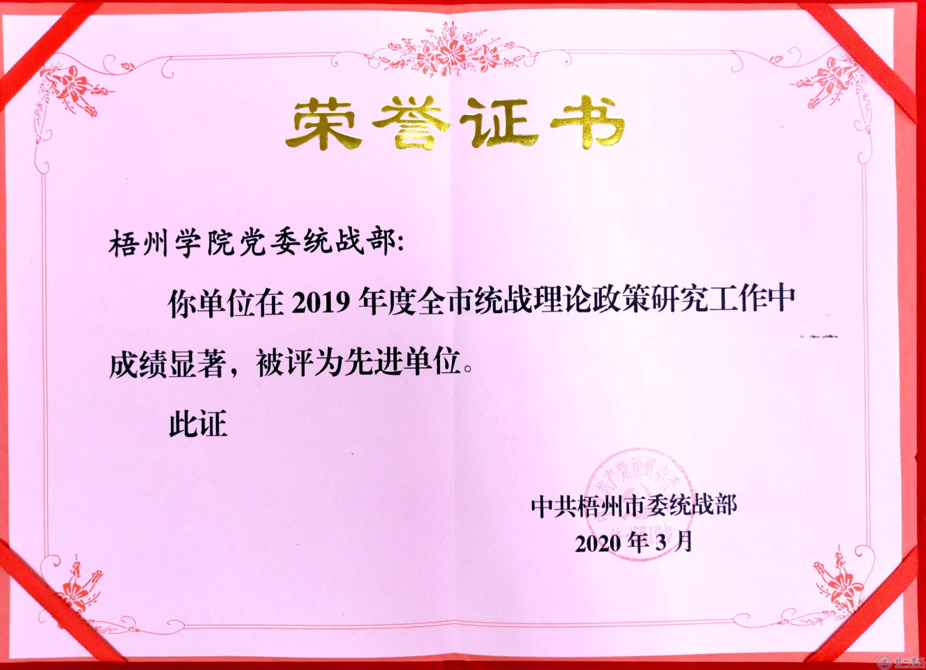 近日,在梧州市统战部长会议上,对一批先进集体和个人进行通报表扬。我校党委统战部荣获2018-2019年度梧州市统一战线先进集体,刘卫东、唐秀文、韦云霞荣获2018-2019年度梧州市统一战线先进个人荣誉称号。