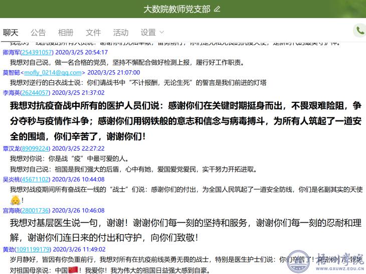 新冠肺炎疫情发生以来,大数据学院教师党支部全体党员深入学习贯彻习近平总书记关于疫情防控工作的重要指示精神,认真贯彻党中央、自治区和梧州市的各项通知要求,以及学校的各项工作部署,充分发挥基层党组织的战斗堡垒和共产党员的先锋模范作用,广大党员积极报名志愿者,踊跃捐款捐助,以实际行动积极支持疫情防控工作。近日,大数据与软件工程学院教师党支部开展党旗飘扬,共同战疫,“我想对您(你)说……”主题党日活动,教师党员积极分享战‘疫’期间心得体会,踊跃表达自己的所思所想,表明坚决打赢疫情防控阻击战的坚定信心。