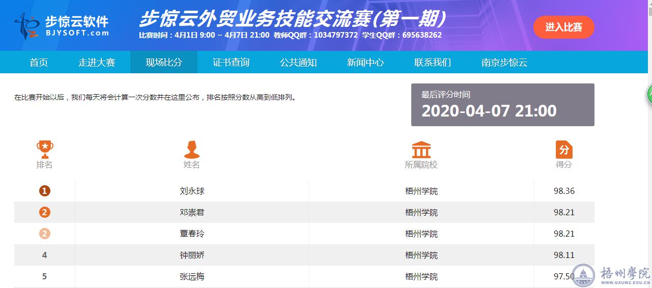 4月7日,为期七天的第一期步惊云外贸业务技能交流赛(线上赛)圆满结束,商学院国际经济与贸易专业派出的29名参赛选手不仅在全国总共832名的参赛选手包揽了全国前五名,来自2019级国际经济与贸易专升本的学生刘永球,则以98.36的高分雄踞全国第一名。