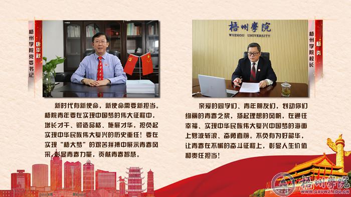 杨奔校长寄语广大梧院青年:“亲爱的同学们、青年朋友们,划动你们绚丽的青春之浆,扬起理想的风帆,在通往幸福、实现中华民族伟大复兴中国梦的海面上劈波斩浪、奋勇直前。不负有为好韶华,让青春在不懈的奋斗征程上,彰显人生价值和责任担当!”