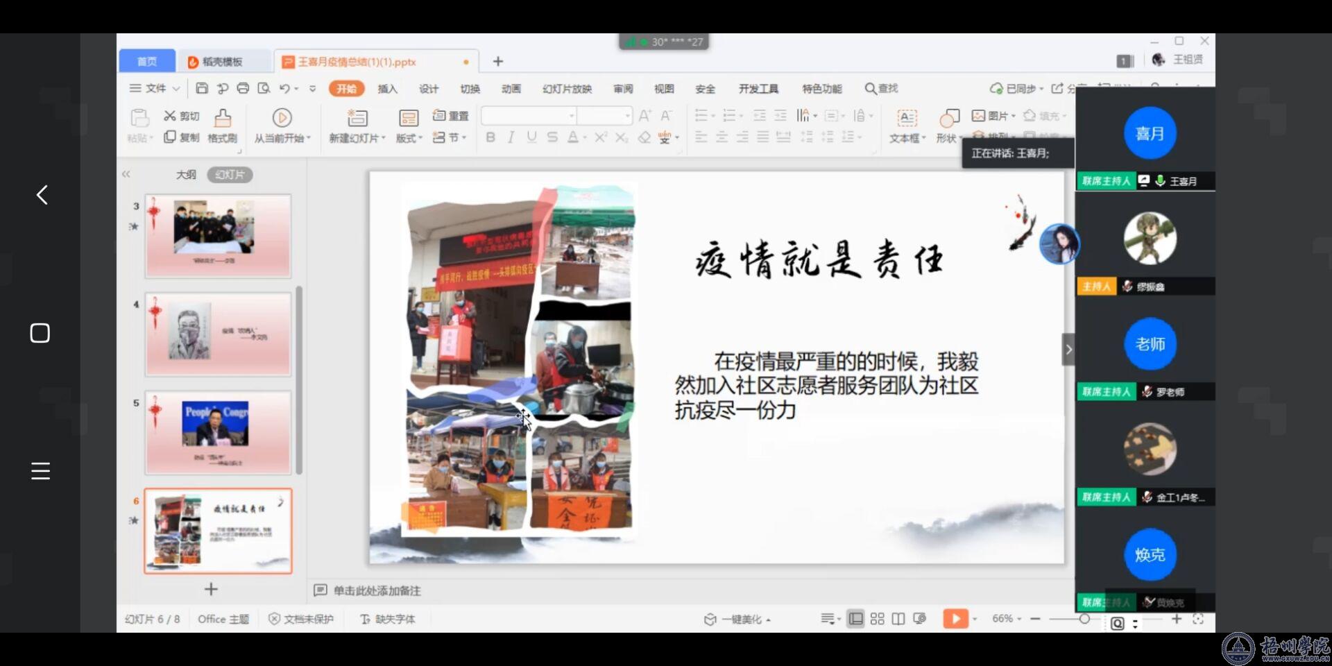 在分享会上,来自18物流管理本科班的李合盛、18工商管理1班的王喜月同学分别结合自己参加基层抗疫志愿服务的经历和体会,与同学们分享了他们心目中的“最美逆行者”的事迹。呼吁同学们传承“五四精神”,作为新时代的青年要勇于担当,敢于作为,为社会做力所能及的贡献,在历练中成长成才。