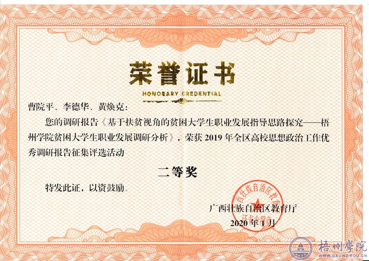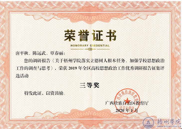 梧州学院贫困大学生职业发展调研分析》获二等奖;唐平秋、陈远武、覃春丽撰写的《关于梧州学院落实立德树人根本任务、加强学校思想政治工作的调查与思考》获三等奖。