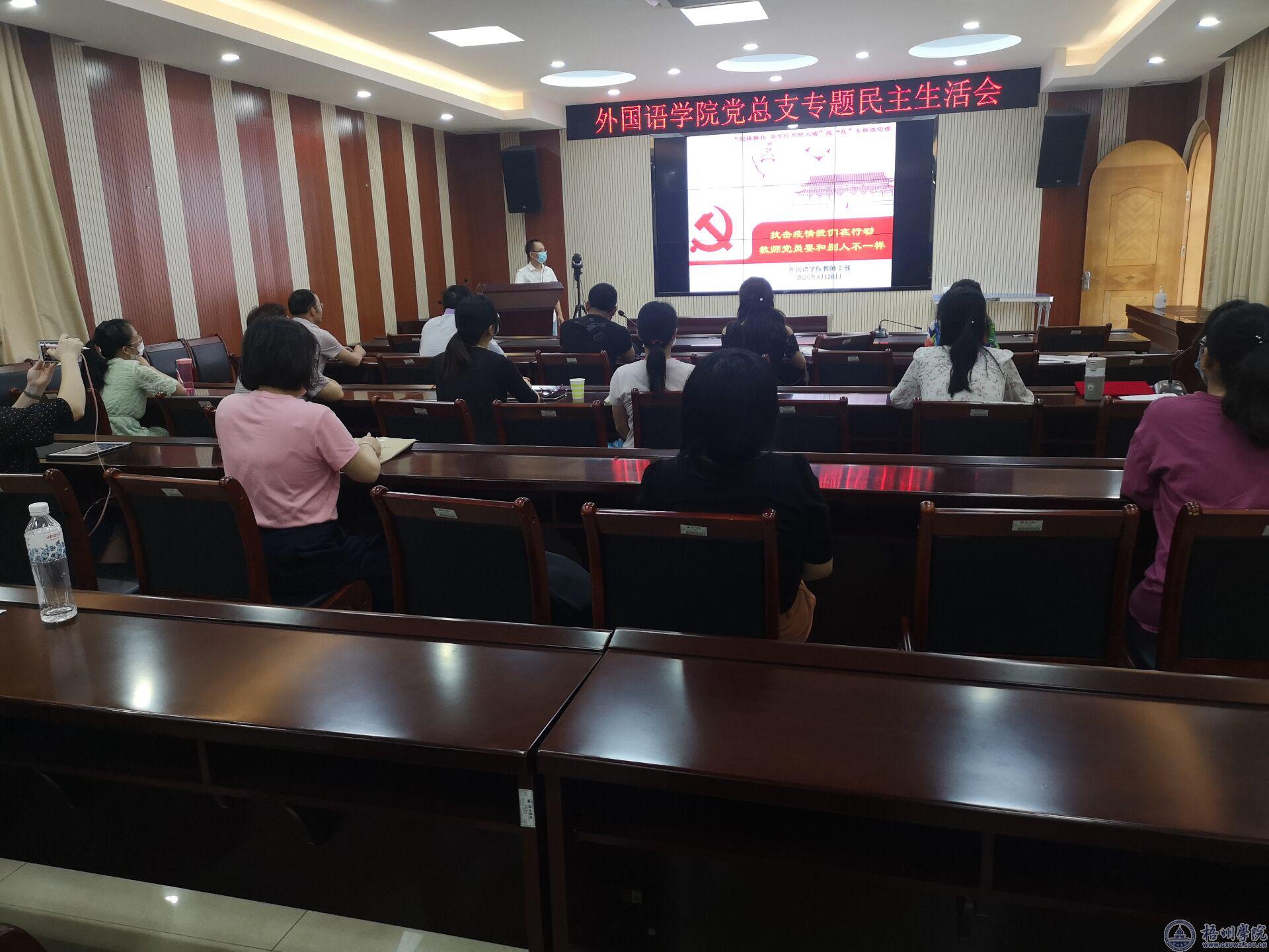 外国语学院教师党支部举行“抗击疫情我们在行动,教师党员要和别人不一样”的“党旗飘扬,筑牢红色防火墙”战“疫”专题党课,教育教师党员时刻要不忘初心,牢记使命,勇于担当,无私奉献,做一个合格的共产党员。