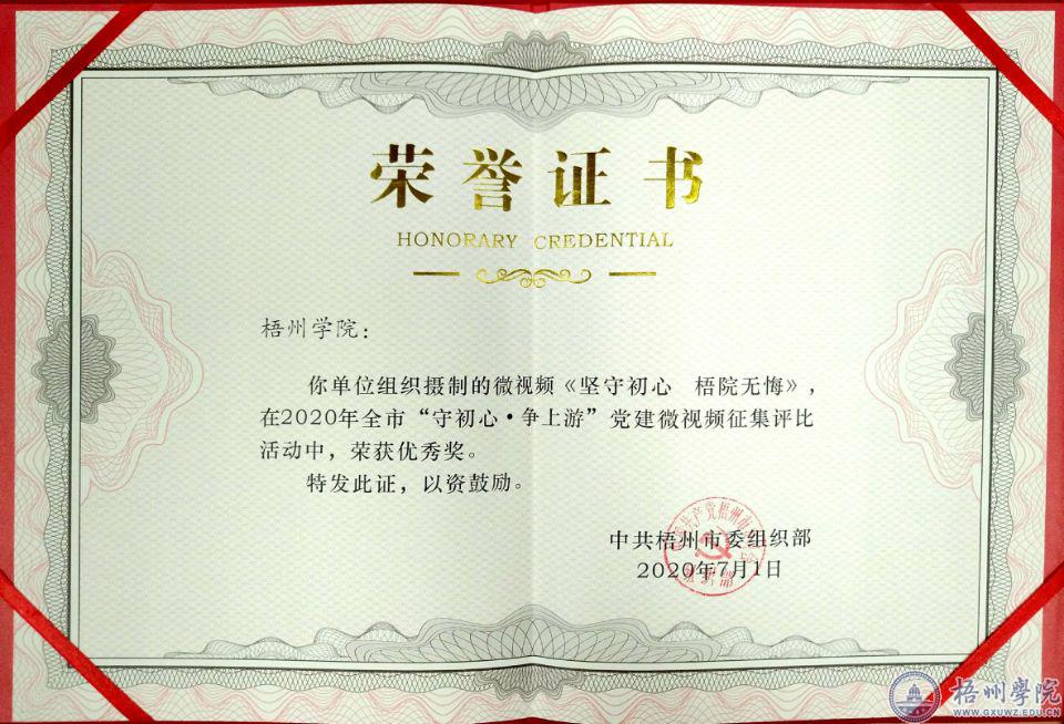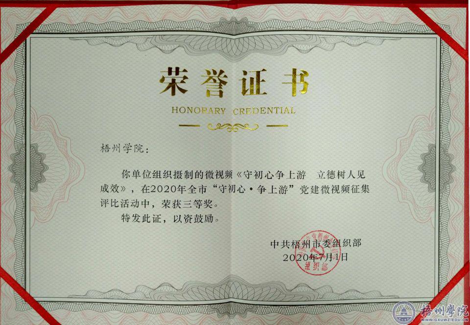 近日,梧州市开展全市“守初心•争上游”党微视频征集评比活动。经过网络投票和专家评审,我校马克思主义学院党总支参评的微视频《守初心争上游立德树人见成效》获三等奖,党委组织部参评的微视频《坚守初心梧院无悔——梧州学院谱写“党建+”引领脱贫攻坚新篇章》获优秀奖。