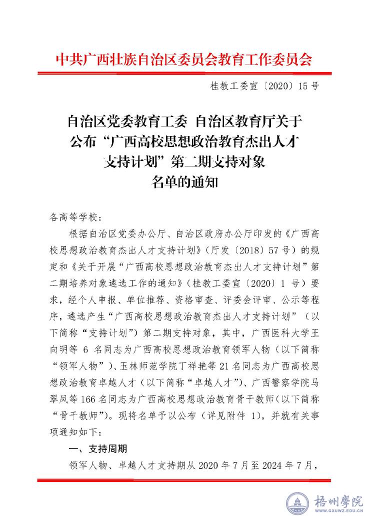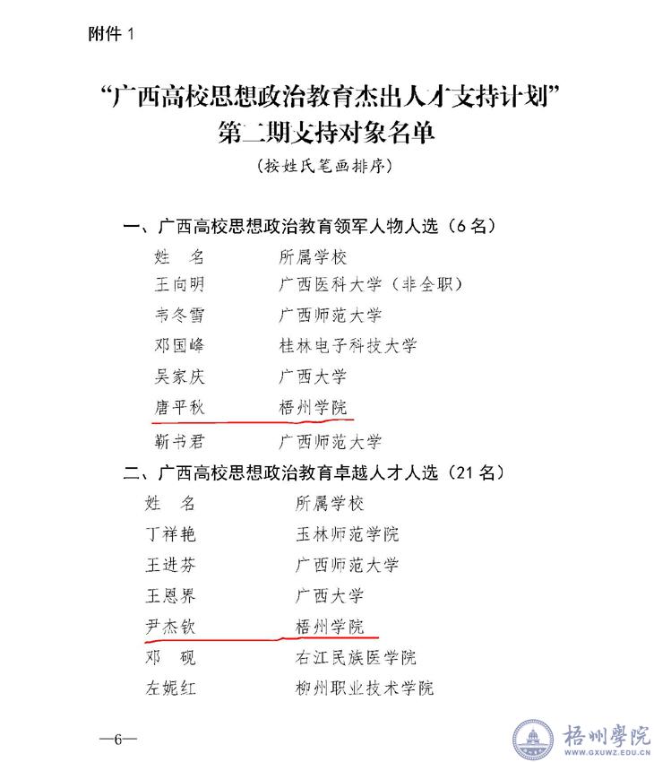 近日,自治区党委教育工委 自治区教育厅公布“广西高校思想政治教育杰出人才支持计划”第二期支持对象名单。我校共有4人入选,其中学校党委书记唐平秋入选“广西高校思想政治教育领军人物”,马克思主义学院院长尹杰钦入选“广西高校思想政治教育卓越人才”,思政课教师尹金萍博士和辅导员黄石莲入选“广西高校思想政治教育骨干教师”。连同第一期支持对象入选“广西高校思想政治教育骨干教师”的唐景成、曾永平、张亚敏,梧州学院入选“广西高校思想政治教育杰出人才”共7人,其中领军人物1人,卓越人才1人,骨干教师5人,在全区同级同类高校中名列前茅。
