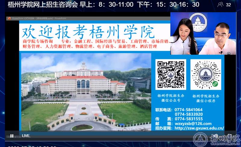 7月24日梧州学院2020年网上招生直播咨询会在学校全媒体中心举行。本次咨询会以网络直播的方式,向考生介绍学校的发展历程、办学规模、院系设置、师资队伍、人才培养、学科建设、优势专业、招生就业等情况。各二级学院积极参与向考生宣传本学院的专业,特别是本学院的办学特色。本次直播观看人次一直在持续增加,每天进入直播间观看人次达2400人次,考生纷纷在直播间进行在线提问,主播的老师们和学校招生办人员就考生的提问一一进行回复。