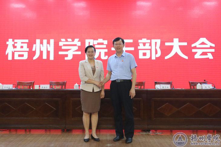 8月4日上午,学校召开干部大会,自治区两新组织党工委专职副书记、自治区党委组织部部务会成员刘水玉在会上宣读了自治区党委关于梧州学院主要领导人事任免决定:任命韦仕珍同志为梧州学院党委委员、常委、书记,免去唐平秋同志的梧州学院党委书记职务,任桂林电子科技大学党委书记。