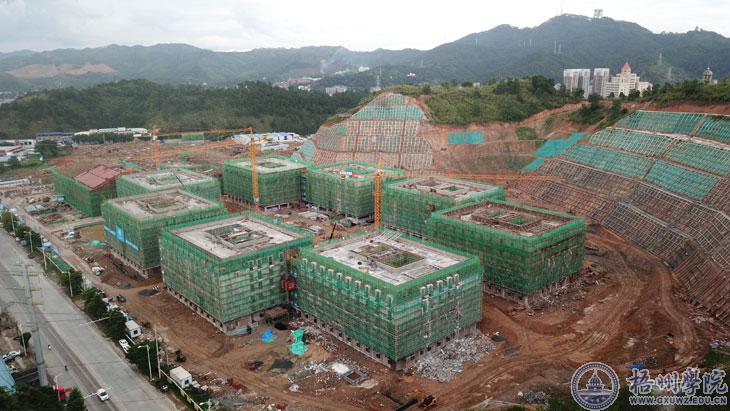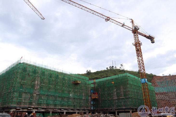 六号学生宿舍楼:主体结构完成,砌体施工完成90%;内部隔墙完成70%;墙面及顶棚腻子完成70%;内墙抹灰完成80%,二层至四层外墙抹灰完成;瓷砖施工完成50%;地下室通风安装完成70%、水电安装完成60%。