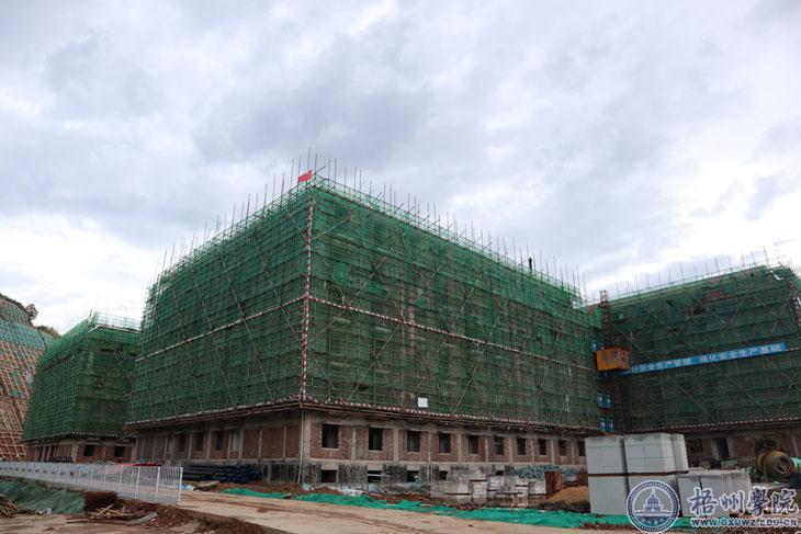 四号学生宿舍楼:主体结构完成,墙体砌筑完成80%,内墙安装完成80%,电气安装完成60%。