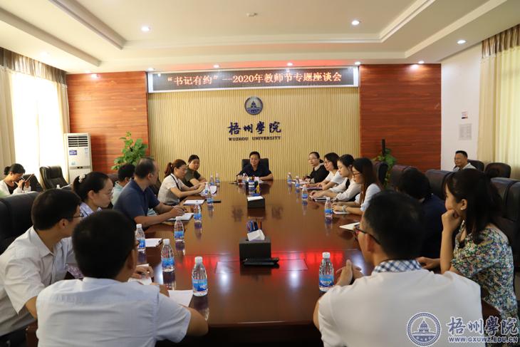| 逐梦前行,感谢有你。9月9日下午,在第36个教师节即将到来之际,我校在明理楼八楼第二会议室召开“书记有约”——2020年教师节专题座谈会。校党委书记韦仕珍出席座谈会,来自学校各二级学院、体育教学部的共22名教师代表参加会议。会议由党委教师工作部长陈健萍主持。