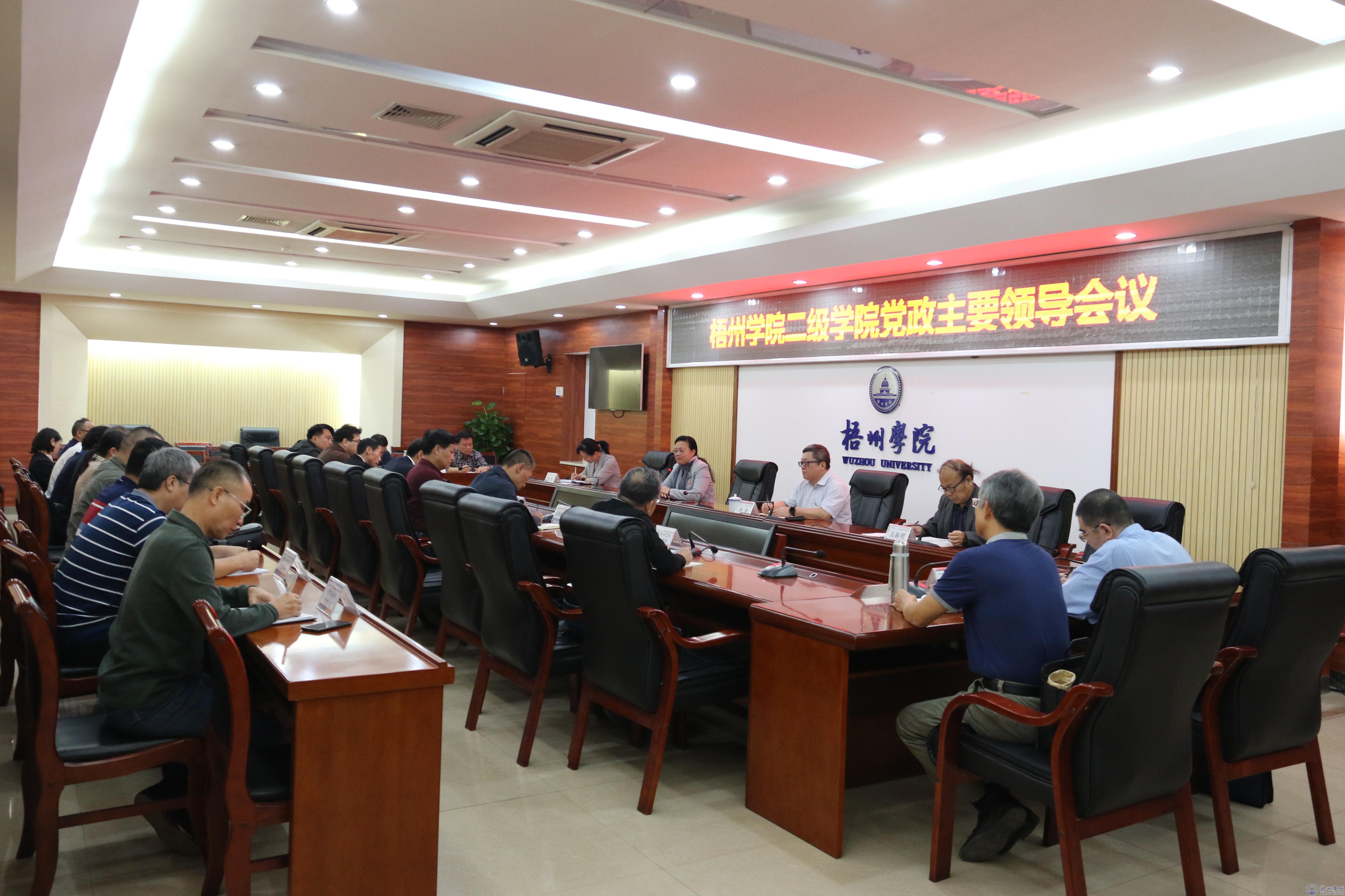 10月8日下午,学校在明理楼第一会议室召开二级学院党政主要领导会议。校党委书记韦仕珍、校长杨奔、校党委副书记曹迎、副校长玉振明出席会议,党委(校长)办公室、学生工作部(处)、后勤基建处、保卫处负责人,各二级学院党政主要领导参加会议。