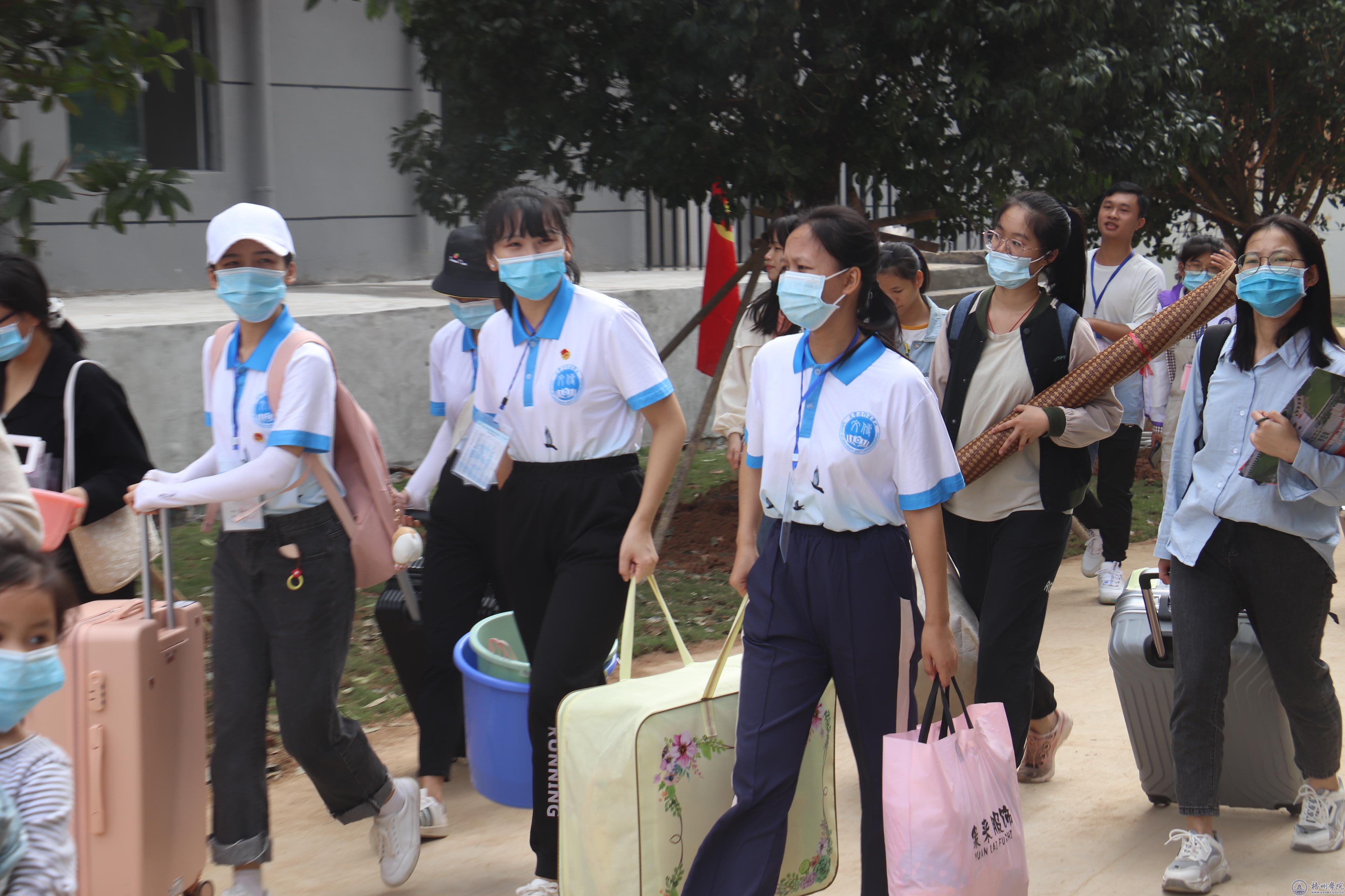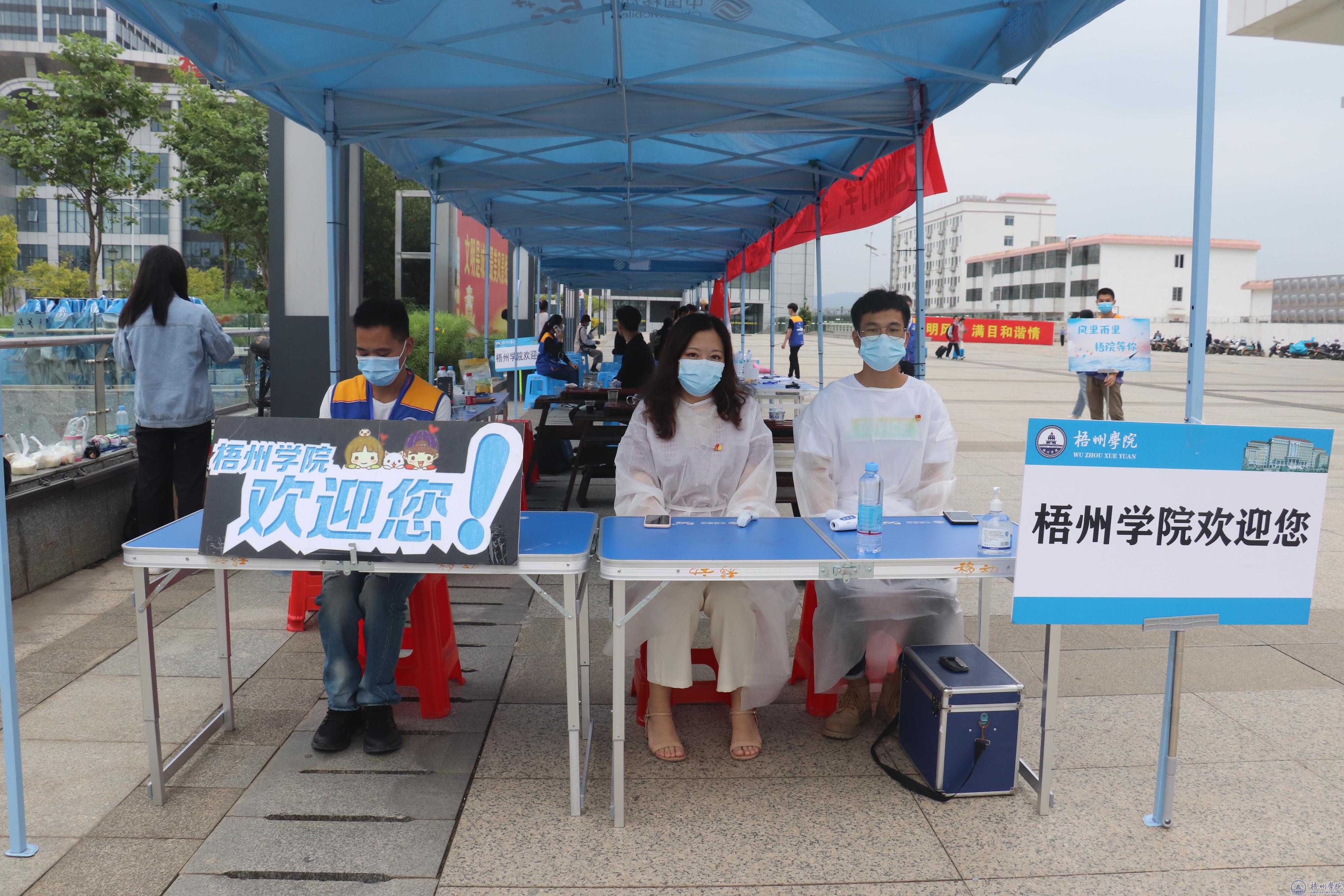 早上7点左右,学校相关工作人员、学生志愿者以及各学院的老师们早早到位,准备迎接新生。在汽车站、火车站、梧州南站等交通站点,那一抹抹白色、黄色、蓝色、绿色的工作服都是负责接待新生的志愿者。他们看见新生从站口走出来,会举着手中写有“梧州学院”的牌子向新生微笑,测温后主动接过他们手中的行李,与他们亲切交流并一路护送上车,直达学校。青年志愿者协会会长韦雅丽说:“作为一名志愿者,不仅是一份光荣也是一份责任。我更希望通过在站点接待新生、指引他们进入学校报道等这些工作,能让新生在陌生的环境里也能感受到家的温暖。”