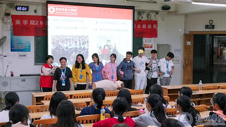 为了提高师生面对校园突发事件的自救和互救能力,10月26日晚,梧州市红十字会专业培训师到我校开展应急救护技能培训。商学院辅导员及部分新生班级共280多人参加培训。