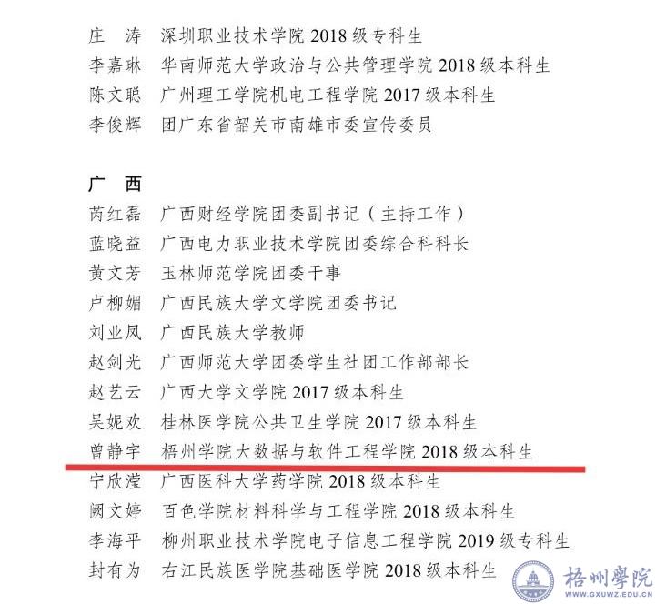 近期,团中央发布《2020年全国大中专学生志愿者暑期“三下乡”社会实践活动优秀个人名单》,我校大数据与软件工程学院2018级物联网工程班曾静宇同学获2020年全国大中专学生志愿者暑期“三下乡”社会实践活动优秀个人荣誉称号。