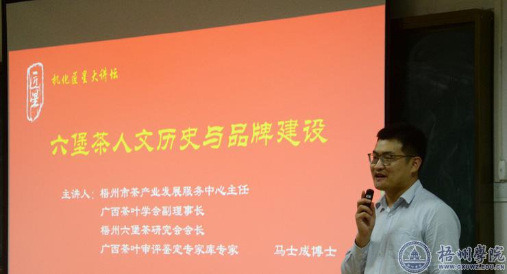 11月27日晚,机化学院在明科楼407教室举办“机化匠星之广西茶文化”活动。梧州市茶产业发展服务中心主任马士成博士应邀为机化学院茶学专业师生作题为《六堡茶人文历史与品牌建设》讲座。机化学院茶学专业教师,其他学院师生,茶学专业学生近200人参加本次讲座。