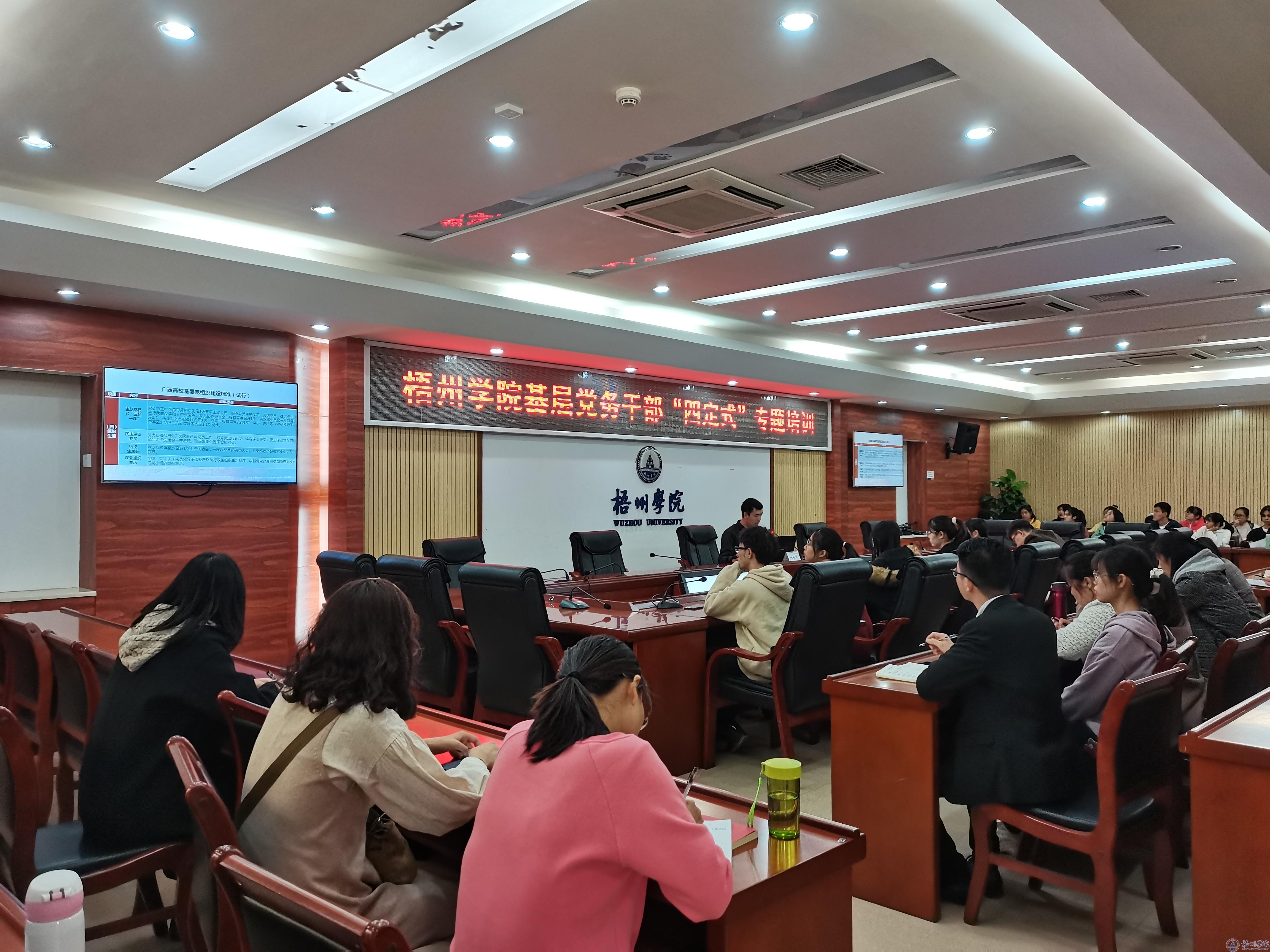 为扎实推进党支部标准化规范化建设,贯彻落实党支部组织生活质量提升行动、党支部达标创优等工作的要求,加强党务干部在支部建设方面的业务能力,12月10日下午,学校党委组织部举办了梧州学院基层党务干部“四定式”专题培训,全体党支部书记、校院二级大学生党建中心负责人参加了培训讲座。