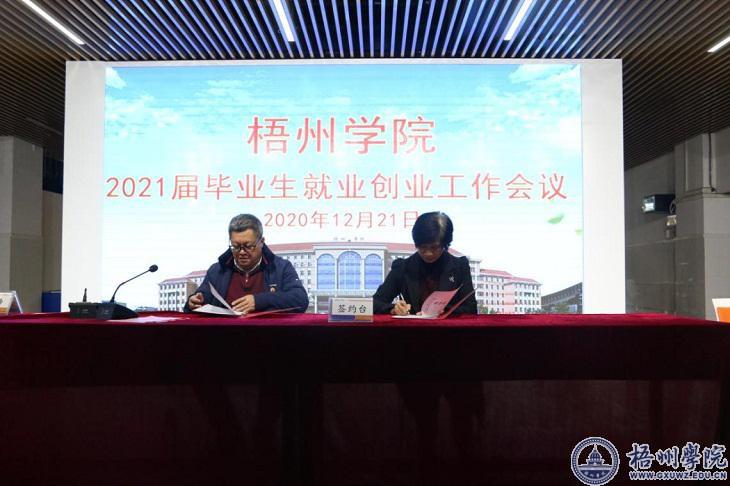 校长杨奔代表学校与学生工作部(处)、外国语学院、文学与传媒学院、法学与公共管理学院等就业创业工作责任单位代表签订2021届毕业生就业创业工作目标责任书。