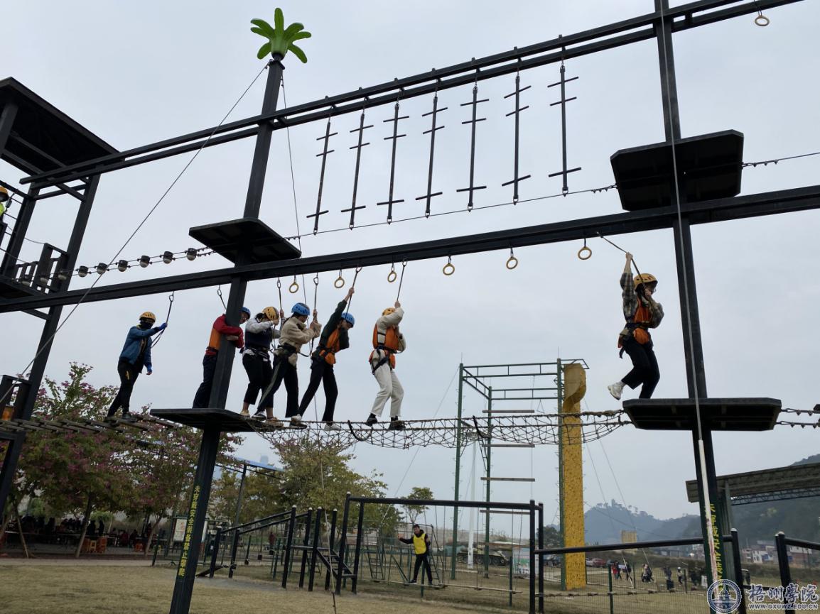 活动中,同学们首先近距离参观了63A水陆两栖坦克、导弹、火炮、鱼雷、高射炮、飞机等中国海陆空三军大型现代军事退役装备。在素质拓展训练环节中,经过专业教练的指导,进行简单的热身活动后,同学们穿上了镭战装备来到实战模拟场地,体验了一场酣畅淋漓的真人野战运动,过了一把“军人瘾”,随后,同学们还克服恐惧走上了“勇士之路”,在3米至6米高的双层高空组合中互相帮助,闯过一个又一个的关卡。