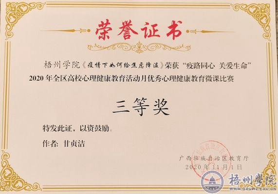 根据《自治区教育厅关于公布2020年全区高校大学生5.25心理健康教育活动月主题活动获奖名单的通知》(桂教思政[2020]17号)文件精神,我校教师甘贞洁的心理健康教育微课《疫情下如何给焦虑降温》荣获“疫路同心 关爱生命”2020年全区高校心理健康教育活动月优秀心理健康教育微课比赛三等奖。
