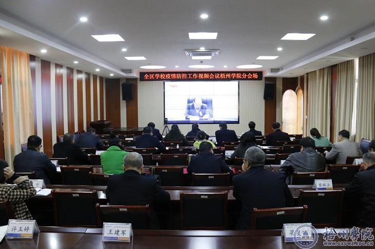 我校在明理楼七楼视频会议室组织收看会议视频,学校领导曹迎、邱房贵、麻新纯,学校新冠肺炎疫情防控工作领导小组成员,各二级学院主要负责人参加会议。