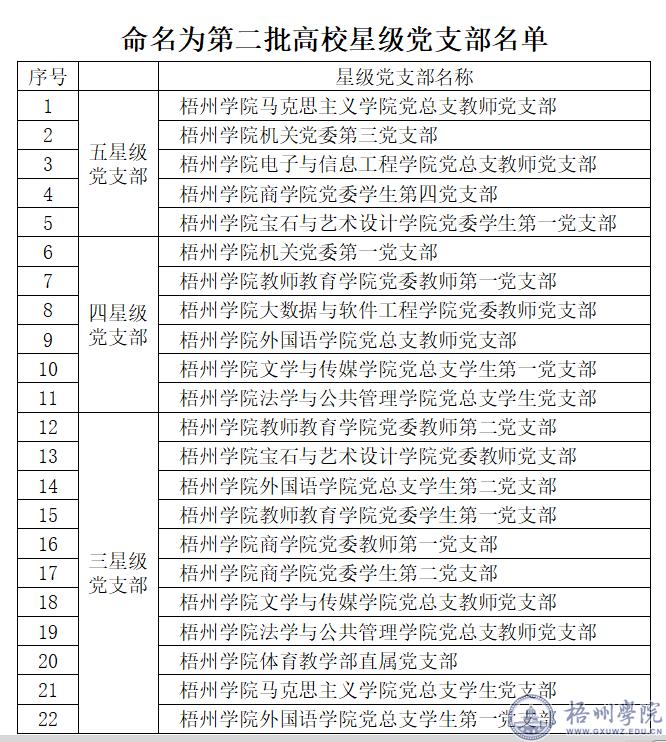 近日,自治区教育工委公布第二批命名为高校星级党支部名单,我校共有22个党支部被命名,其中,马克思主义学院党总支教师党支部等5个党支部被命名为五星级党支部,机关党委第一党支部等6个党支部被命名为四星级党支部,教师教育学院党委教师第二党支部等11个党支部被命名为三星级党支部。