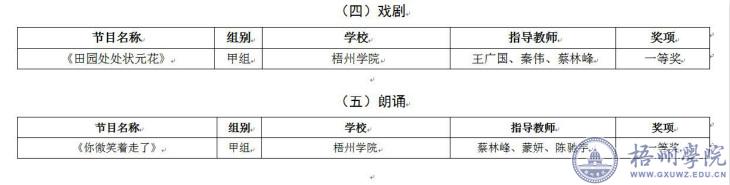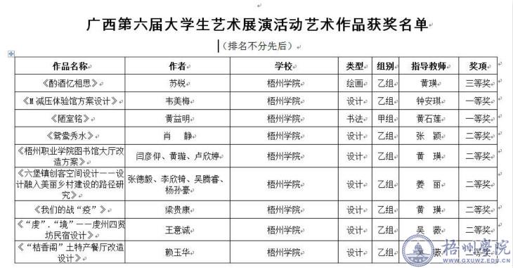 近日,从《自治区教育厅关于公布广西第六届大学生艺术展演活动评选结果的通知》(桂教体卫艺〔2021〕1号)获悉,我校在广西第六届大学生艺术展演活动中取得优异的成绩:我校荣获广西第六届大学生艺术展演活动优秀组织奖;选送艺术表演类节目中甲组舞蹈《长鼓悠悠》和甲组戏剧《田园处处状元花》荣获优秀创作奖,选送的7个艺术表演类节目获一等奖5项,二等奖2项;选送的20个学生艺术作品获一等奖2项、二等奖8项、三等奖10项;选送的学生艺术实践工作坊获得二等奖1项;选送的7个美育改革创新案例二等奖4项、三等奖3项。其中声乐类甲组合唱《春怨》 《The Water Dance Of Lluvia》(雨之水舞)和舞蹈类甲组《长鼓悠悠》两个节目,代表广西选送全国第六届大学生艺术展演活动。